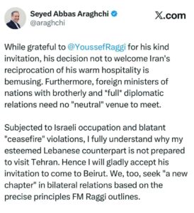 با توجه به اشغالگری اسرائیل در لبنان و نقض آشکار «آتشبس»، کاملاً درک میکنم که چرا همتای لبنانی ارجمندم آماده سفر به تهران نیست. از این رو با کمال میل دعوت او برای سفر به بیروت را میپذیرم.